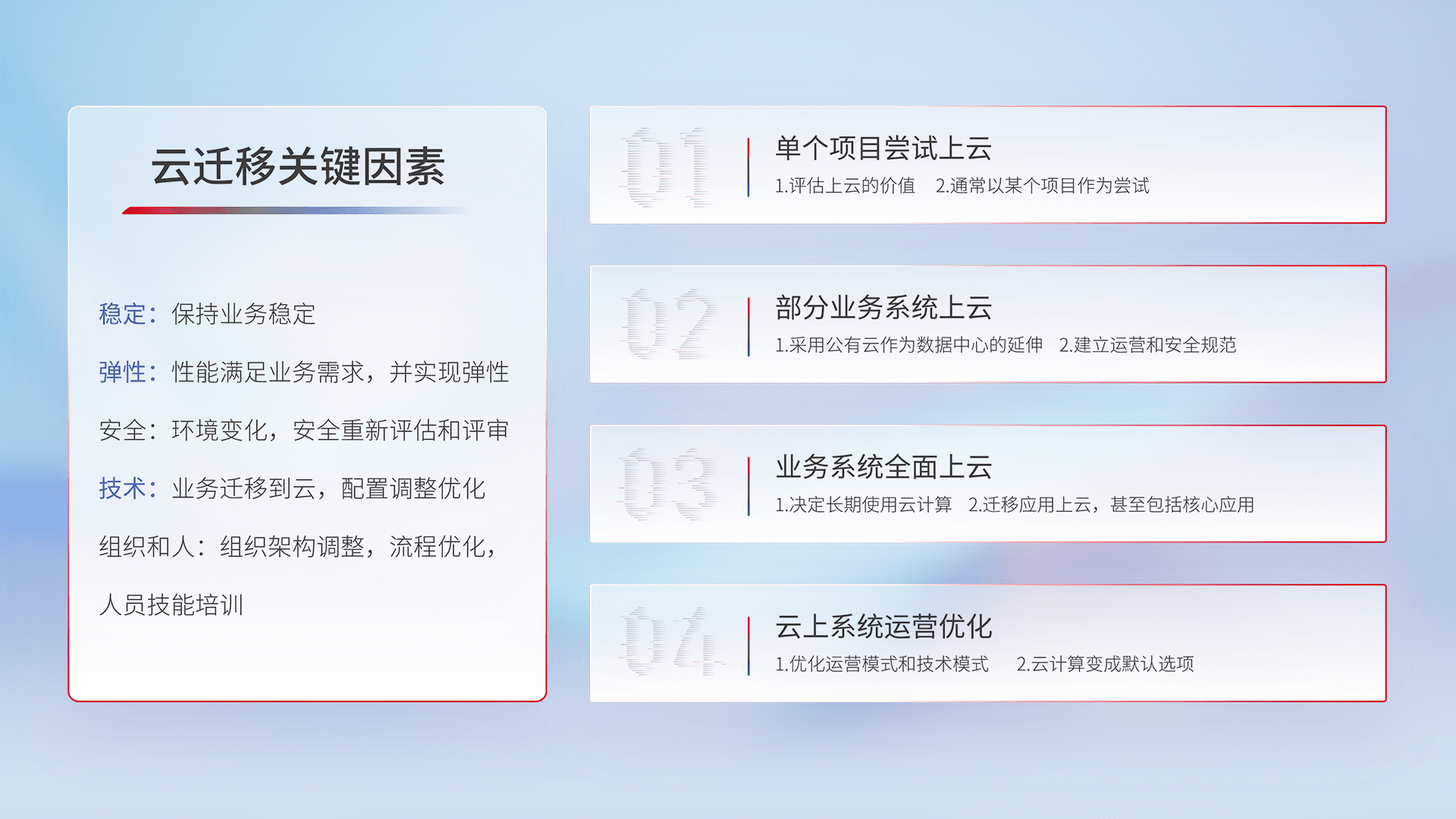 结合实际业务,,从规划设计、、云平台选型、、云原生改造、、数据迁移、、、、集成交付,,迁移全过程为客户识别最佳上云路径,,,,做好风险识别管理,,,,设计网络架构、、、、身份权限、、安全审计合规、、操作审计、、、、日志审计、、监控告警策略、、、多站点容灾设计等,,,对云上基础设施进行整体规划,,,提升IT治理水平,,,,以满足弹性、、、高可用、、、高性能的需求。。。