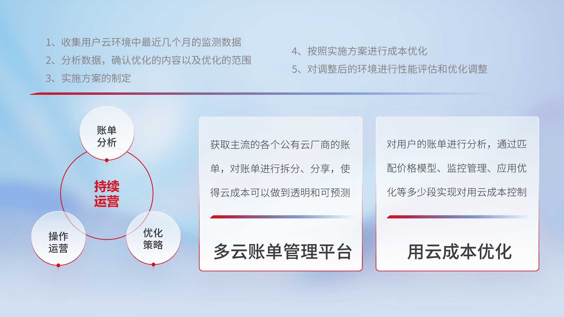 通过多云纳管,,,以统一的资源数据模型把客户的云资源进行抽象和封装,,进而实现对多云资源的统一操作,,保障云资源管理的可靠性、、稳定性与可用性。。量身定制化运维内容,,配置、、、开发运维、、、补丁管理、、、、备份、、、监控、、、、认证和访问管理、、、、审计和日常巡检等,,,保障在用云过程中的可靠度,,稳定度以及高可用率。。。。